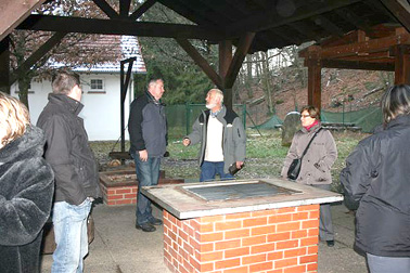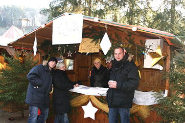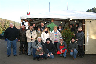 Es kann los gehen. Und da kommen auch schon die ersten Standbetreiber: Ulrike Cusminus aus Trippstadt, Ursula Kallmeyer aus Fischbach, Karl-Heinz Klöpfer aus Weidenthal, Marion Haag aus Elmstein, Klaus Czarnecki aus Kaiserslautern sowie eine Mannschaft vom Birkenhof in Weidenthal. Wie man sieht ist das Umland gut vertreten mit Honig, Met, Wildspezialitäten,Waffeln, Glühwein, Punsch und Kunsthandwerk. Eine bunte Mischung also und bunte Gerüche -- gerade richtig für einen Weihnachtsmarkt.