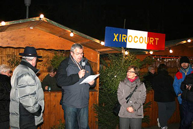 Zu einem Zwischenstop kehrte man bei der Familie Pfeifer ein wo Marliese Pfeifer eine herrliche Kaffeetafel vorbereitet hatte. Am Samstag um 17 Uhr war es dann soweit. Ortsbürgermeister Franz Pfeifer konnte eine große Schar von Marktbesuchern aber auch die Betreiber der Stände begrüßen. Sein ganz besonderer Gruß galt aber der Bürgermeisterin unserer Partnergemeinde, Marie Hélène Phulpin und den mitgereisten Gemeinderatsmitgliedern sowie den Freunden vom Kulturverein ALEX und seinem Vorsitzenden Jaques Hériat. Dabei übergab er den Erlös aus dem Verkauf des Glühweins beim Besuch des Nikolausmarktes in Xirocourt.