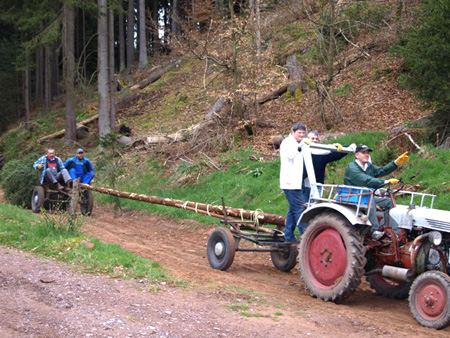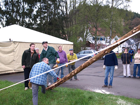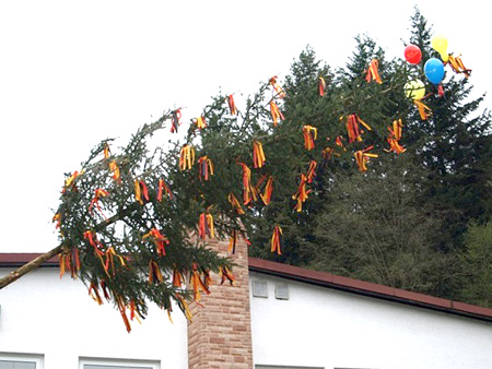 Traditionell wurde der Maibaum, eine 15 Meter hohe Fichte, am Vortag geschlagen, mit schwarz-rot-goldenen Bändern und Luftballons geschmückt und aufgestellt. Dazu trafen sich ca. 25 freiwillige Helfer, die das Aufstellen des Baumes direkt danach mit Freibier und einem kleinen Imbiss gebührend feierten.