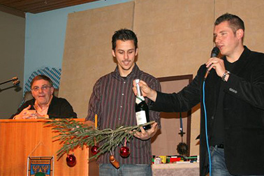 Der alljährliche Höhepunkt im Programm war natürlich wieder die Versteigerung des Christbaumes. In seiner lockeren Art hatte Sven Pfeifer wieder die Rolle des Versteigerers übernommen. Tannenzweige, bestückt mit Kerzen, Christbaumkugeln und Würsten wurden angeboten. Dazu kamen natürlich wieder andere Dinge wie Wein, Eintrittskarten für die ASV-Prunksitzung am 14. Februar 2009. Besonders begehrt waren natürlich die beiden Trikots des 1.FC Kaiserslautern. Wie in jedem Jahr bildete die Versteigerung der Christbaumspitze den Abschluss. Sie war garniert mit allerlei Köstlichkeiten.