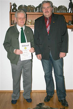 Ebenfalls eine hohe Ehrung erfuhr Willi Jud. Er ist seit 40 Jahren Mitglied des ASV. Wegen seiner Erkrankung wurde die Ehrung in seiner Wohnung durch den 1. Vorsitzenden Franz Pfeifer vorgenommen (siehe Bild). Er erhielt die goldene Ehrennadel überreicht. Jürgen Feth, der ebenfalls verhindert war, wird ebenfalls noch nachträglich für seine 25-jährige Mitgliedschaft mit der silbernen Ehrennadel geehrt werden.