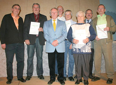 Dann kam es zu den Ehrungen. Eine Auszeichnung der besonderen Art - die bronzene Verdienstnadel des Südwestdeutschen Fußballverbandes -- erhielten durch den Spielleiter der Kreisliga und stellvertretenden Kreisvorsitzenden Robert Thielmann, unterstützt vom 2. Vorsitzenden des ASV, die folgenden Personen (auf dem Bild von links: Hans-Jürgen Walzer, Robert Thielmann und die Geehrten Franz Pfeifer, Siegfried Wegert, Uli Walzer, Hedwig Früh, Helmut Pfeifer und Rudolf Walzer). Nicht auf dem Bild, da verhindert Werner Zimmermann, Egbert Gasiorek und Werner Schwarzelbach.