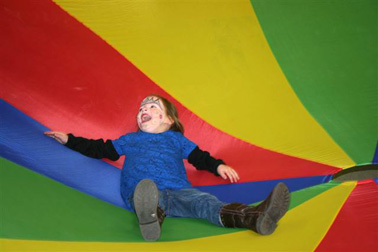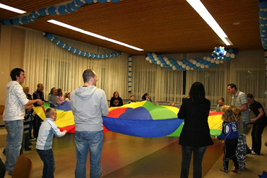 Die "Kleinen" bauten zudem eine Eisenbahnlandschaft aus Holz auf. Der Renner des Abends aber war das Schwungtuch. Es ähnelt einem Fallschirm und bietet ungeahnte Möglichkeiten zum Spielen. Einige Bilder zeugen davon. Ortsbürgermeister Franz Pfeifer ließ es sich nicht nehmen, nach einer abendlichen Sitzung vorbei zu schauen um am bunten Treiben teil zu haben.