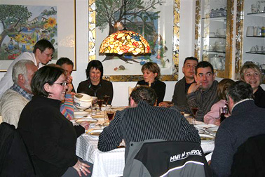 Den Abschluss der Begegnung bildete ein gemeinsames Abendessen. Natürlich gab es ein Spezialgericht aus Lothringen: "Potée lorraine un tarte à la mirabelle avec de la poudre d´amande". Und als Nachspeise: Mirabellekuchen mit Mandelpulver.: Aber auch das ist ja von früheren Besuchen bekannt: Zu Essen verstehen die Franzosen, da sind sie einfach Spitze. Und bei gutem Essen lassen sich denn auch gute Pläne schmieden. Denn das ist doch klar: Diese Partnerschaft hat durch die neue Bürgermeisterin nicht nur die administrative Weihe wieder erhalten, sondern auch neuen Schwung. Ganz besonders freuen sich die Waldleininger, dass Madame Phulpin mit den französischen Freunden zumWeihnachtsmarkt nach Waldleiningen kommen wird. Und natürliche freuen sich auch alle auf Jaques Hériat, dem Vorsitzender der Alex, der an diesem Tag zur Höchstform aufgelaufen war. Und dann gibt es wieder Küsschen rechts und Küsschen links als Ausdruck einer echten Freundschaft.